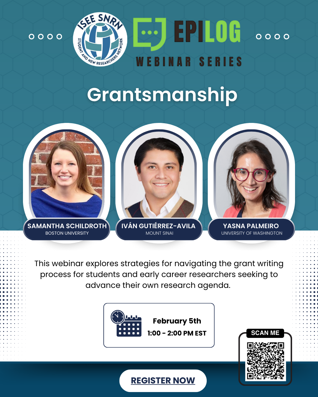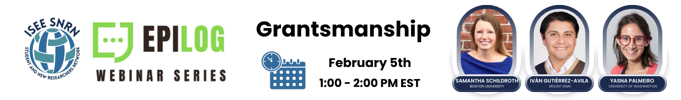 The SNRN presents EPILOG, a webinar series that showcases the work and experiences of trainees and seasoned researchers in environmental epidemiology. By providing a platform for scholars to share their experiences and insights, EPILOG seeks to facilitate meaningful exchange and promote lifelong learning within our student and early career researcher community. The name of the series is a play on words that combines EPI as in “epidemiology” and LOG as in “logging one’s experience,” while also referencing the word “epilogue,” which refers to a conclusion or closing remarks at the end of a speech or book. Our hope is that EPILOG will serve as a valuable resource to many.